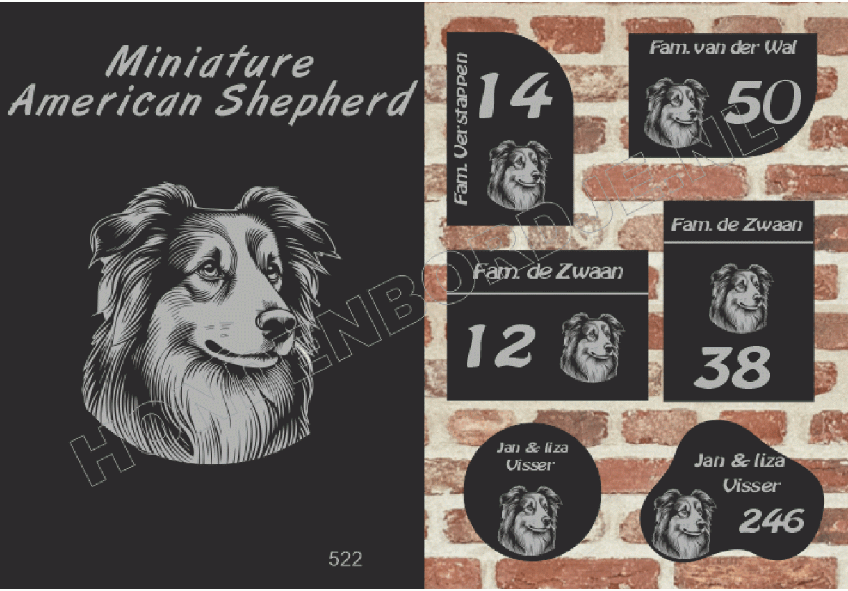 Naambord met Miniature American Shepherd.