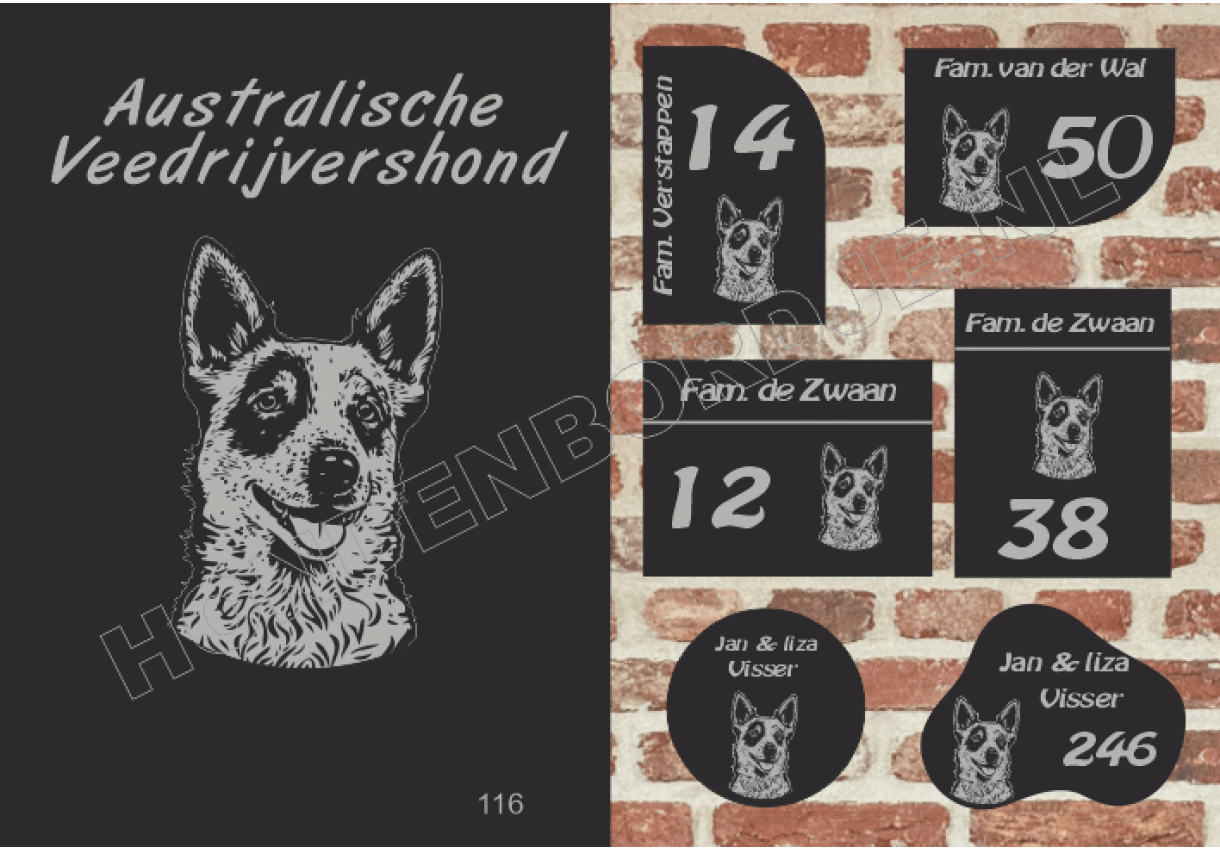 Naambord met Australische Veedrijvershond.